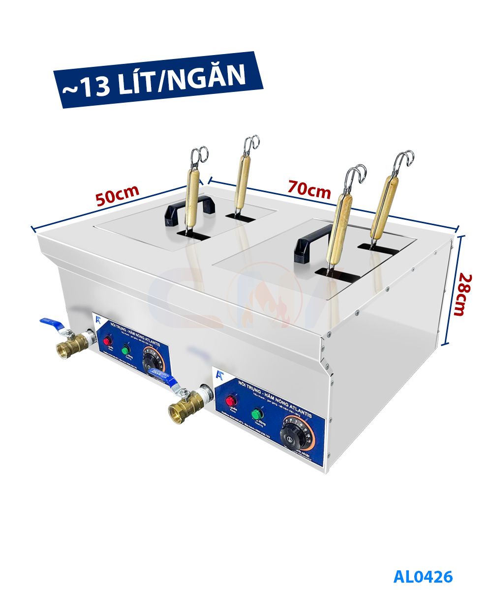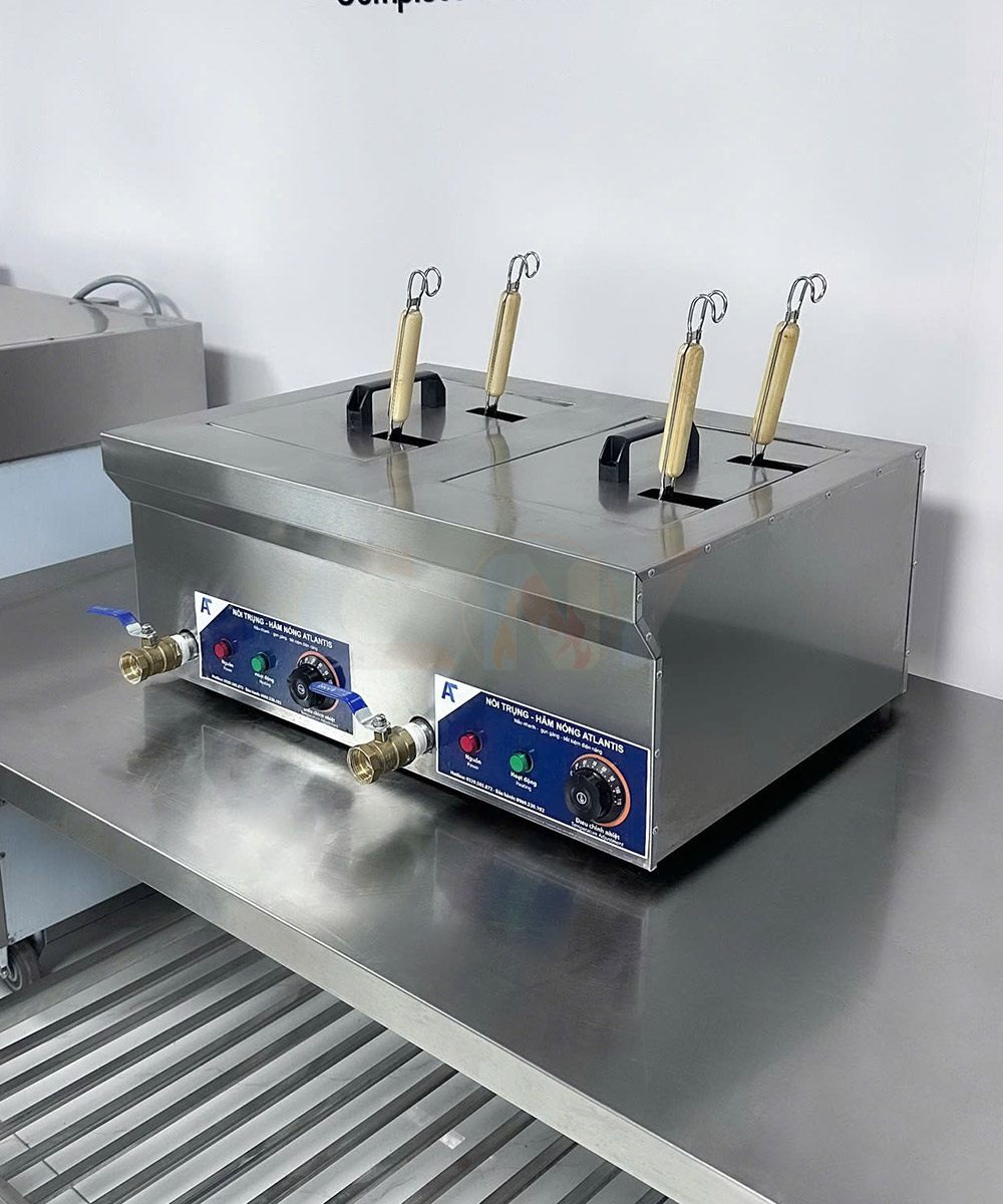 Bếp trụng bún phở 2 ngăn Atlantis có 4 giỏ trụng công suất 6kw, mỗi ngăn 1 mâm nhiệt công suất 3kw. Đun sôi nước 8-12p chỉ mất 1.000đ tiền điện. Mỗi giờ đun liên tục chỉ mất ~3k tiền điện.