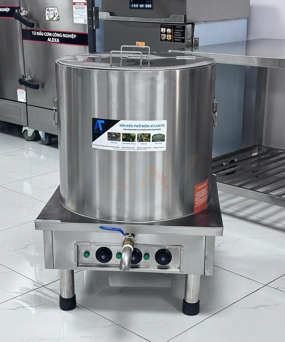 Nồi nấu phở 100 lít mâm nhiệt Atlantis là lựa chọn lý tưởng cho các quán ăn quy mô lớn, phục vụ khoảng 150–160 tô phở mỗi ngày. Với khả năng ninh xương hiệu quả, nồi giúp nước dùng đậm vị, thơm ngon và ổn định suốt ngày dài.